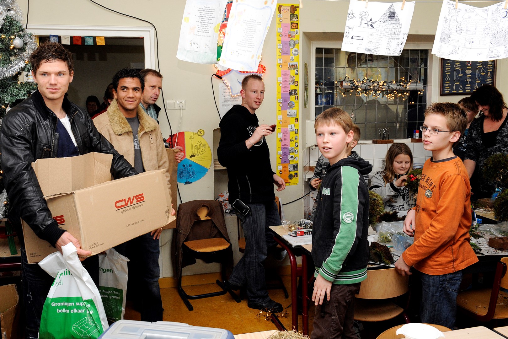 Vrijdagmiddag werd Arjen in zijn klas op de Venemaschool in Westerlee verrast door Marcus Berg en Luciano da Silva en kreeg hij allemaal nieuwe spullen voor in de nieuwe slaapkamer, die hij over een paar maanden weer wil inrichten.