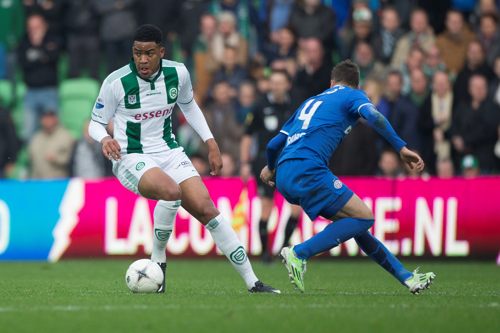 Op de eerste maandagavond van maart 2015 startte Jong FC Groningen nog met het maximale aantal van vijf dispensatiespelers tegen FC Volendam. Van de eerste selectie van FC Groningen stonden Peter van der Vlag, Danny Hoesen en Hilal Ben Moussa aan de aftrap. Cambuur had bovendien het kwartet Marlon Pereira, Calvin MacIntosch, Donovan Slijngard en Sebastian Steblecki afgevaardigd. Hoesen viel vijf minuten voor rust uit met knieklachten. Ben Moussa werd volgens afspraak na een uur gewisseld.