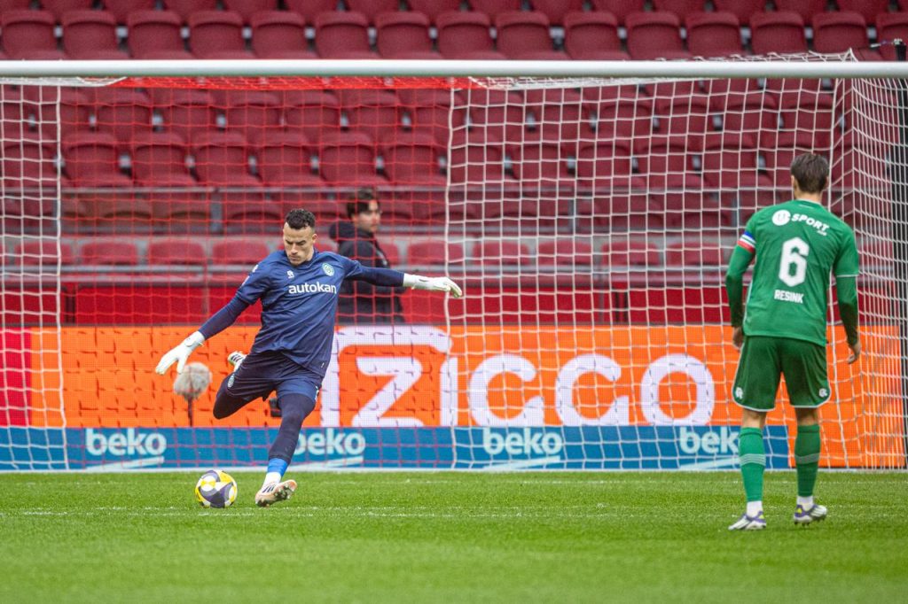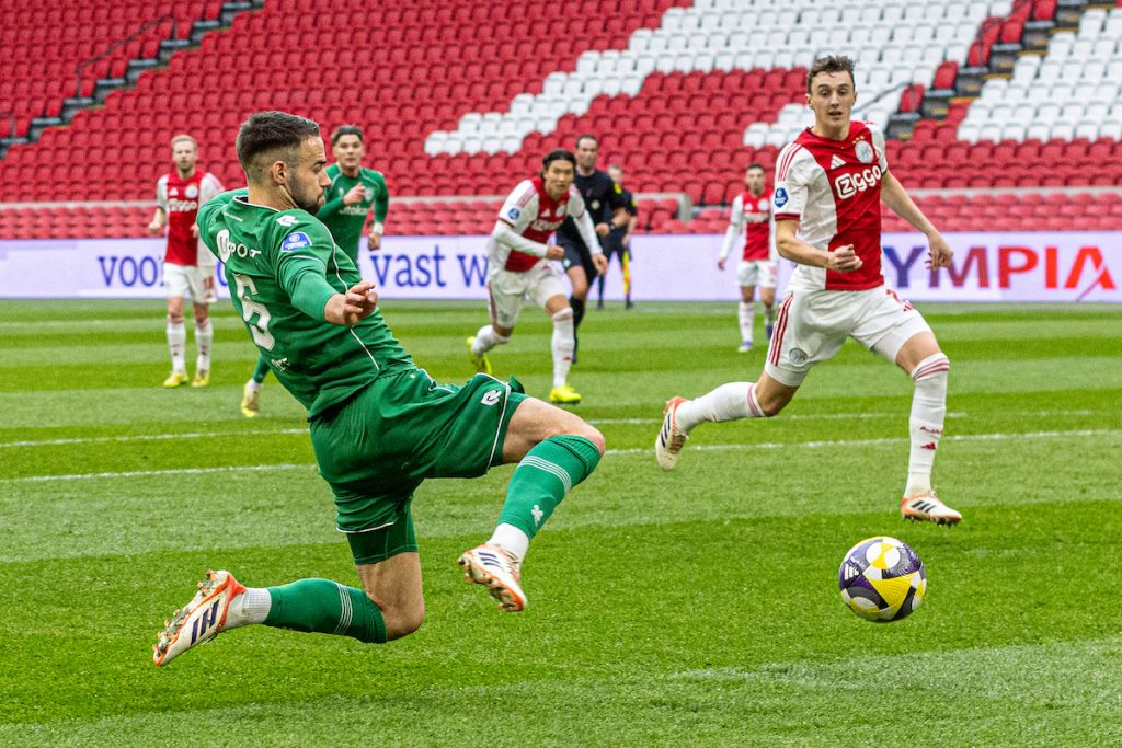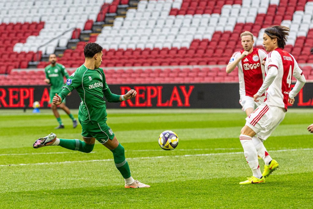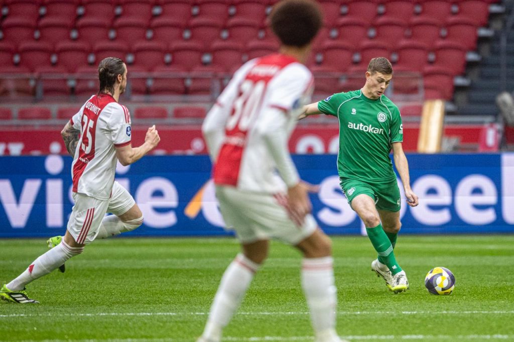 Aan de andere kant was Godts vlak voor rust gevaarlijk voor de Amsterdammers. Keeper Vaessen pakte zijn inzet knap waardoor het bij rust 1-0 stond in de lege Johan Cruijff ArenA. FC Groningen vuurde negen keer richting het Amsterdamse doel in de eerste helft.