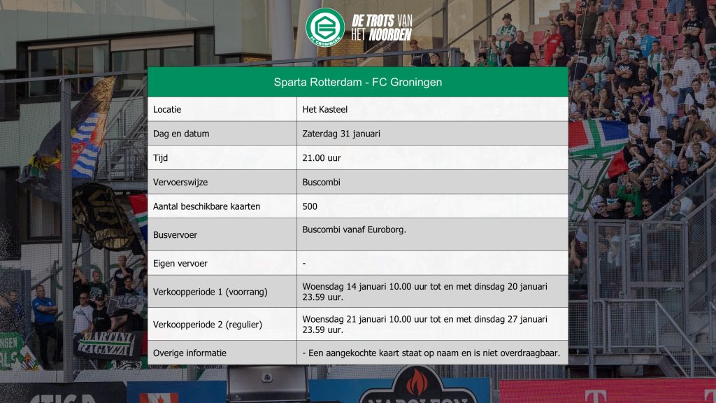 FC Groningen wordt aankomende zondag in Heerenveen gesteund door een uitverkocht gastenvak. Voor de tweede uitwedstrijd van het kalenderjaar gaat de FC op bezoek bij Sparta Rotterdam. Op zaterdag 31 januari wordt om 21.00 uur afgetrapt op Het Kasteel. Er geldt een verplichte buscombi. Kaarten voor bus en wedstrijd kosten €42,50 per stuk. Supporters die horen bij de voorrangsgroep kunnen vanaf woensdag 14 januari 10.00 uur een ticket kopen via https://tickets.fcgroningen.nl