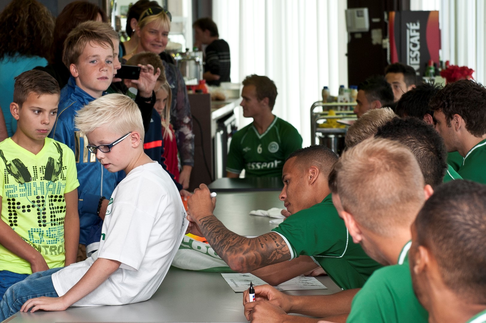 Tussen 13.00 uur en 14.00 uur passeerden bijna tweehonderd mensen (inclusief ouders/begeleiders) de toegangsdeur tot ‘de huiskamer’ van de spelers van FC Groningen in Euroborg: het Spelershome. Daar zaten – op Nick van der Velden na – alle selectiespelers te wachten op de ongeduldige en nieuwsgierige kinderen. Van der Velden is de kersverse vader geworden van een dochter en was vandaag (woensdag – red.) om die reden niet op de club.