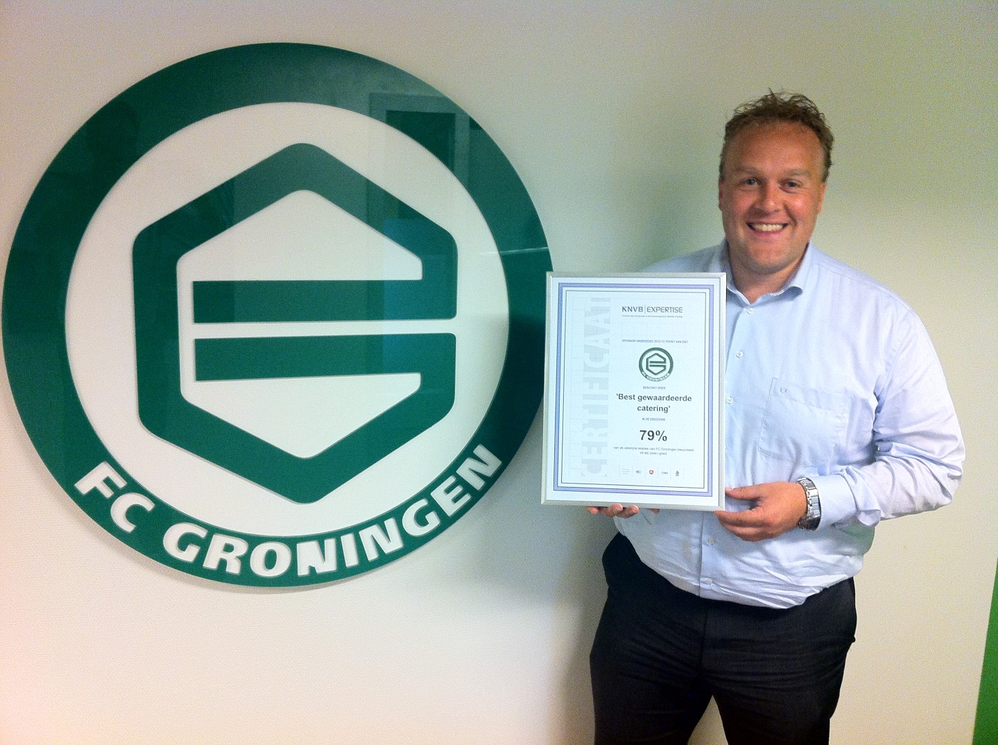 De zakenrelaties van FC Groningen beoordeelden de catering van Euroborg Horeca als de beste. Liefst 79 procent van alle deelnemende businessrelaties van FC Groningen kwam tot het oordeel ‘goed’ tot ‘zeer goed’. Manager Wim van Tellingen van Euroborg Horeca poseert dan ook trots met de oorkonde en betrekt vooral zijn mensen bij de toekenning van de prijs. “Ik mag dan weliswaar op de foto met deze mooie prijs, maar alle lof en waardering gaat uit naar alle horecamedewerkers, die voor dit succes hebben gezorgd.”
