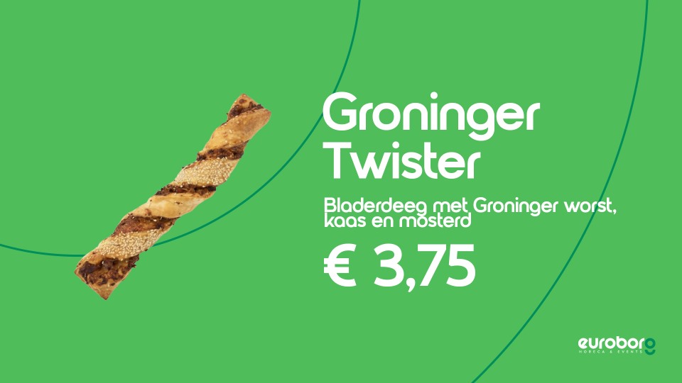 Nieuw is de Groninger Twister. Een bladerdeegstengel met Groninger droge worst, kaas en mosterd. Een idee dat is ontstaan uit een samenwerking met de buren in het Euroborg-complex; leerlingen van het Noorderpoort. De Groninger Twister is zondag te koop op de Noordtribune. In de units met een frituur zijn onder meer patat, frikandellen en loempia’s verkrijgbaar. Familieporties kippeling zijn bij alle verkooppunten te koop.